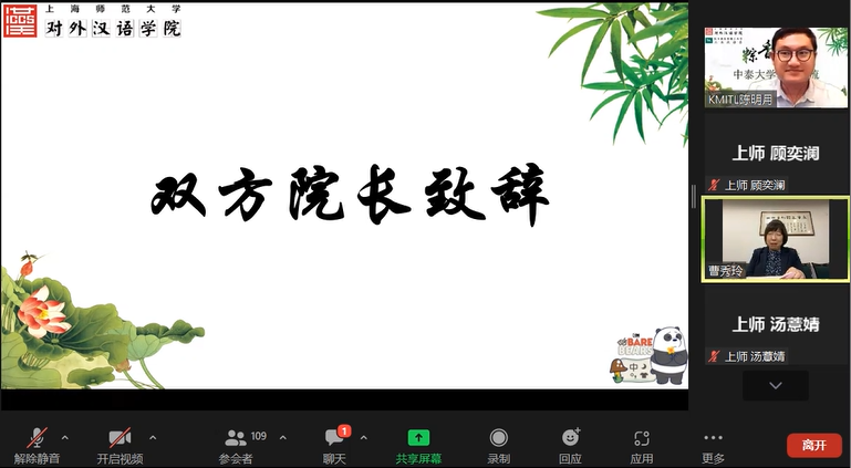 活动伊始,上海师范大学米粒av 院长曹秀玲和拉卡邦先皇理工大学人文学院院长塔娜婉·萍娜菈分别致辞并介绍学院基本情况。曹秀玲院长向云端的泰国师生致以热烈欢迎,塔娜婉·萍娜院长表示希望双方在今后能够长期交流合作。
