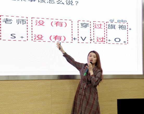在上半场的汉语教学技能大赛决赛环节,25名选手按照抽签顺序上台展示个人的教学片段。参赛选手们的说课和教学环节既规范有序又活泼,课件制作精美,动感十足,与现场观摩的师生互动积极活跃,每位选手教学展示之后,评委老师从教学内容、教学方法、教学设计、教授的语言点等方面进行提问,选手们进行即时应答。