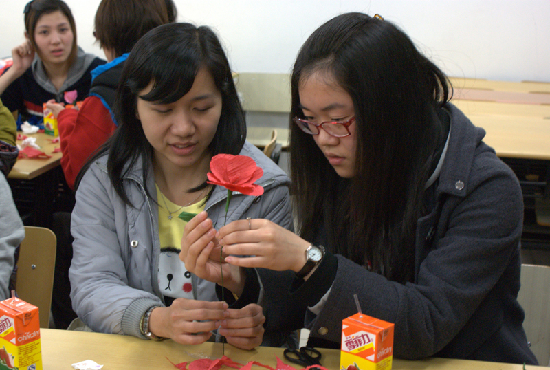 下午1点40分,活动正式开始。在欢乐的音乐声中,留学生与大一大二的同学通过“找朋友”活动分成了14个小组。首先由中国学生介绍了上海的美食、建筑和娱乐等活动,留学生们兴致勃勃地参与了讨论。之后,中外学生开始合作制作纸玫瑰,大家互帮互助,气氛融洽。半个多小时后,精美的玫瑰花绽放在学生们的手中,中外学生纷纷将自己制作的手工艺品送给自己的新朋友作为留念。