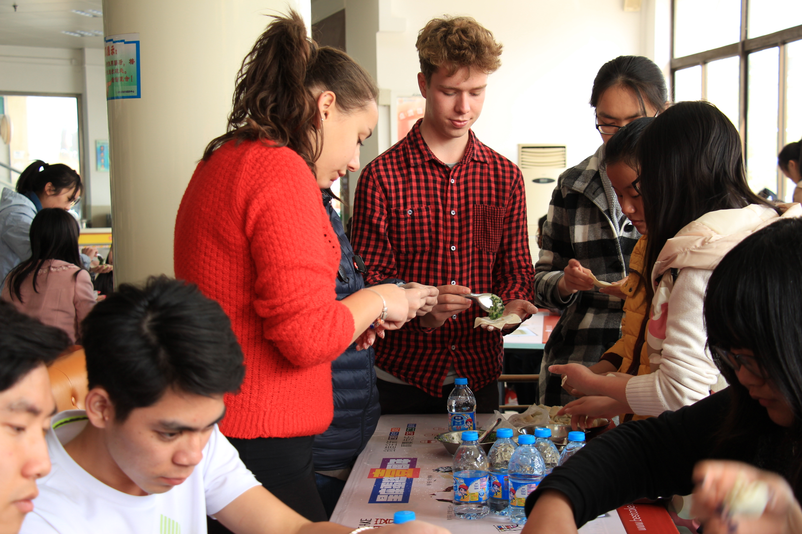 两百多名外国留学生和奉贤校区本科生热情参与了中外交流活动。交流活动分两个部分,第一部分是中外志愿者前往海湾小学与小学生互动交流,春暖童心爱满海湾;第二部分是中外学生在紫藤食堂交流饮食文化,一起动手包春卷、包馄饨,共同欢度春日时光。学院党总支书记武长河、副书记唐洁、团委书记蔡俊杰一同参与了活动。 下午1点,两辆大巴驶入海湾小学校园,热烈沸腾的欢呼声,好奇期盼的眼神,小学生们对留学生的到来表现出了极大的热情。外国学生同样兴奋不已,用不太熟练的汉语热情地打招呼。志愿者们先按班级把小学生分为四组与相应的外国留学生结对,然后排队到大操场上开始交流活动。有的外国留学生为小朋友表演节目、介绍自己或自己的国家,让小朋友们增长见识开阔眼界;有的留学生带着小朋友一起玩老鹰抓小鸡和丢手绢游戏,欢声笑语童心荡漾;有的留学生则跟着小朋友学做广播操,充分体验中国小学生的活力。最后中外志愿者与小学生一起合影,记录下这美好春日的动人一刻。 接着,中国本科学生与外国留学生来到紫藤一楼。中国学生向留学生介绍中国饮食文化,并一对一耐心地教外国留学生包中国传统美食春卷和馄饨。外国留学生无不惊叹传统小吃手法的精致与细腻,纷纷动手,边学边交流,现场气氛顿时热闹起来。在一番辛苦之后,中外学生共同品尝自己的劳动成果,共享美食的美好时刻。 “春暖童心,爱无国界”,中外志愿者用自己的爱心激发了民工子弟的好奇心和求知欲,在春日融融的日子里放飞梦想和希望;“美哉中国,美在外汉”,中外学生中国学生与留学生结对,也让外国留学生享受中国传统美食,亲身体验了中国传统文化。 (供稿:王惠英)