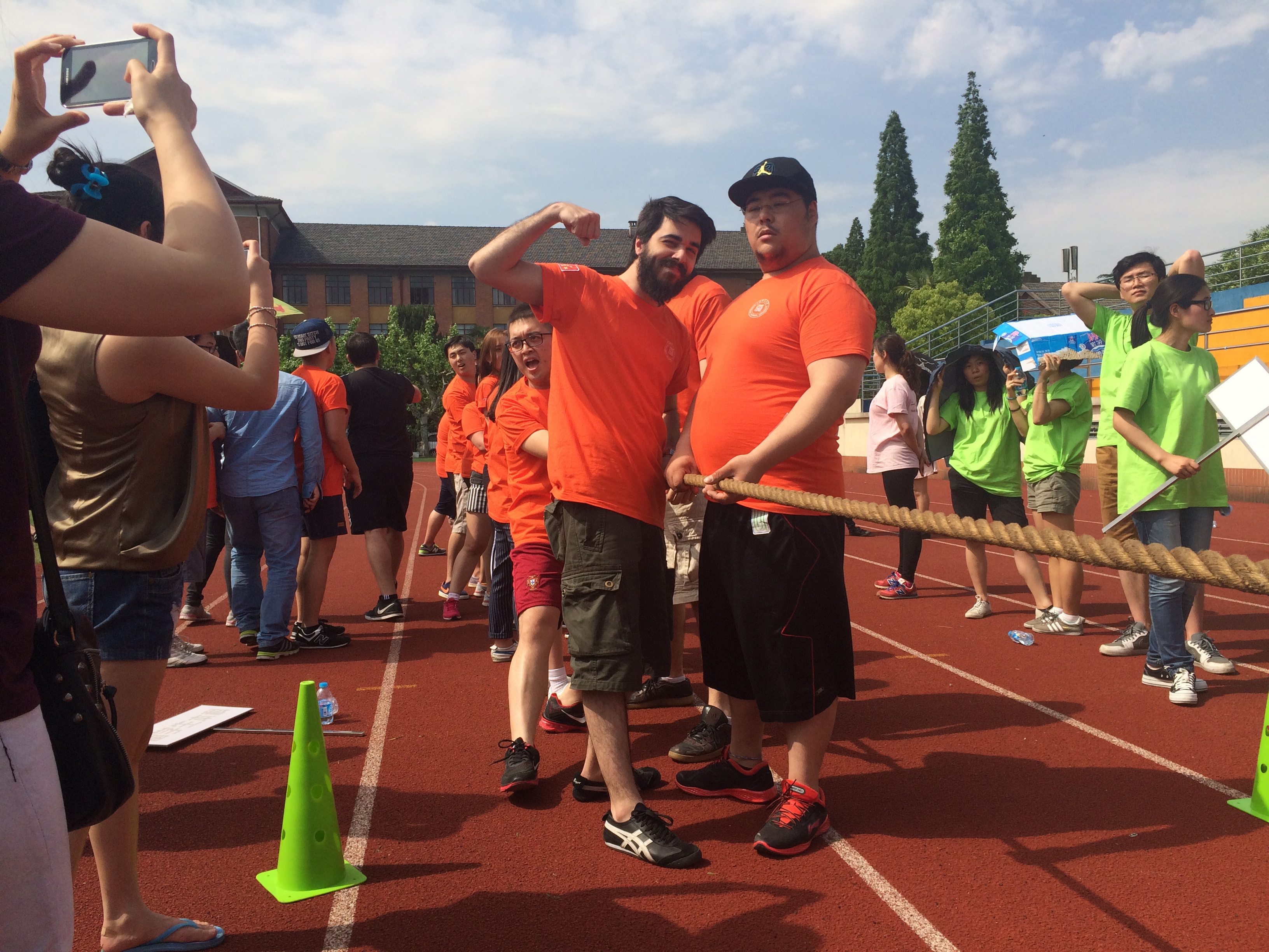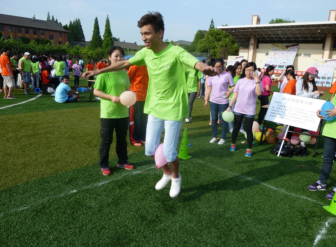 各个班级代表队各具风格的入场式拉开运动会的序幕,紧接着是曹秀玲院长致辞并宣布比赛正式开始。开场第一项便是传统却永远具有魅力的“合力拔河”。一开场,便引爆了现场的气氛,选手们拼尽全力,啦啦队们声嘶力竭地为选手们呐喊。一队队的比赛过后,14级汉硕的中外研究生凭借过人的实力获得了冠军。拔河比赛过后,便是考验团队配合力的七人八足了。这是一项由七人共同配合完成的团体比赛,队员手挽手站成一排,相邻的两只脚绑在一起,在裁判的一声令下集体冲刺。伴随着“一二一二”的呼喊,团队成员目标一致,团队意识和激情都在这短短的十几米中高度升华,最终中等二级获得了第一名。接下来进行的是“指压板跳大绳”和“一鼓作气”两个项目。在“跳大绳”比赛中,同学为了集体的荣誉,都无畏指压板的“威力”,一个接一个脱了鞋子在指压板上高高跳起、落下,忍受着脚部的刺激和疼痛,一次次冲进绳索,看得一旁的观众“心惊肉跳”。最后商务汉语班以84个的优异成绩取得该项目的冠军。在“一鼓作气”比赛中,成员之间要步调一致,拉紧绳索,通过控制鼓来弹动皮球,趣味盎然。在现场观众的欢呼声中,泰国西北大学队以44个获得第一名。