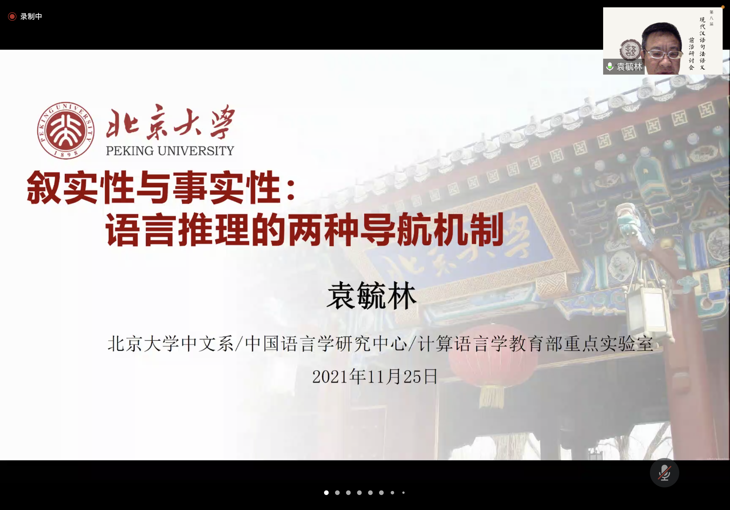 11月25日晚,北京大学中文系博士生导师袁毓林教授应邀为米粒av 师生带来了一场题为《叙实性与事实性:语言推理的两种导航机制》的讲座。为配合疫情防控要求,本次讲座以线上形式进行,讲座由研究生院常务副院长、博士生导师陈昌来教授主持。