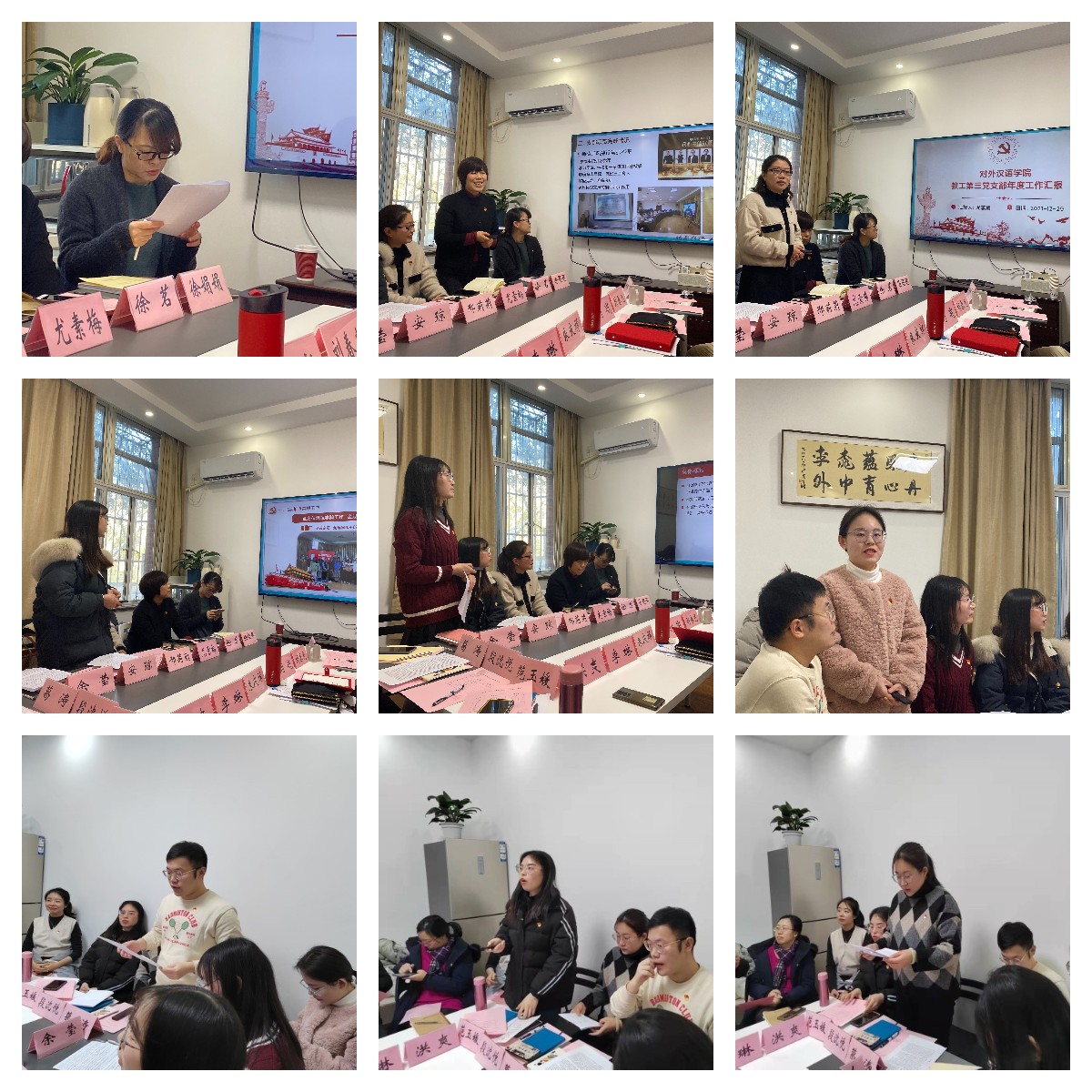 学院教工党支部的三位支部书记围绕支部政治把关作用发挥情况、在师德师风建设中作用发挥情况、发展教师党员情况、教工党员“岗位创建”情况、“我为群众办实事”实践情况等方面对本年度的支部工作做述职汇报;六位学生党支部书记则围绕对学生政治引领和入党启蒙教育情况、入党积极分子培养情况、学生党员积分制管理落实情况,学生党员常态化教育、“设岗定责”活动落实情况及党员作用发挥情况进行汇报。
