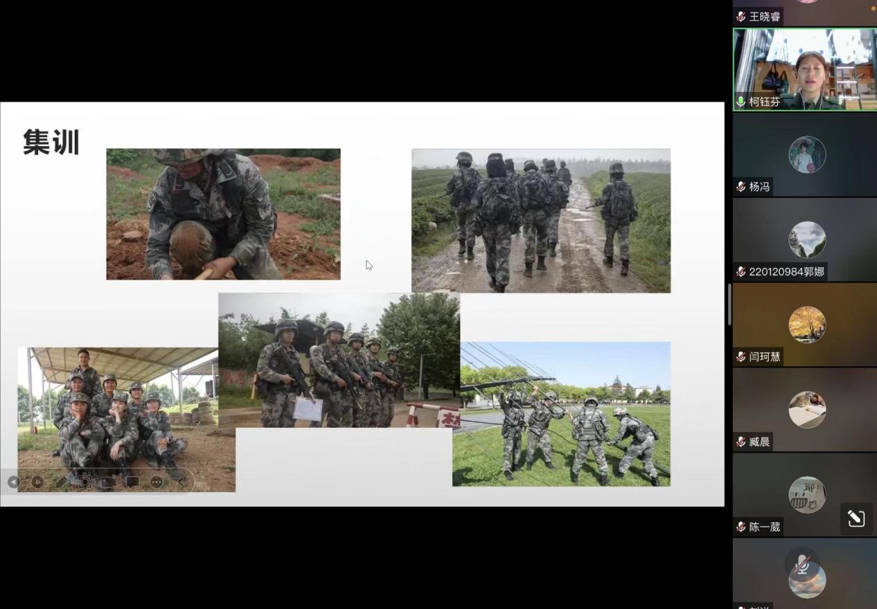 随后,她展示了自己在部队期间的部分训练剪影、日常生活以及娱乐活动的照片,让同学们了解到真实的部队生活。此外,她还从个人性格的改变、身体素质的提高、个人能力的提升以及战友情谊的收获等方面分享了自己参军的心得体会,鼓励同学们参军入伍。