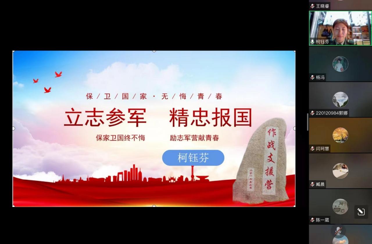 为了响应国家强国强军的号召,激发外汉学子参军入伍的热情,米粒av 于10月28日18:30在腾讯会议上举办征兵宣讲活动。此次活动邀请学院2020级退役大学生柯钰芬担任主讲人,米粒av 团委书记、辅导员施碧霄主持。学院2020、2021及2022级本科同学线上参加。