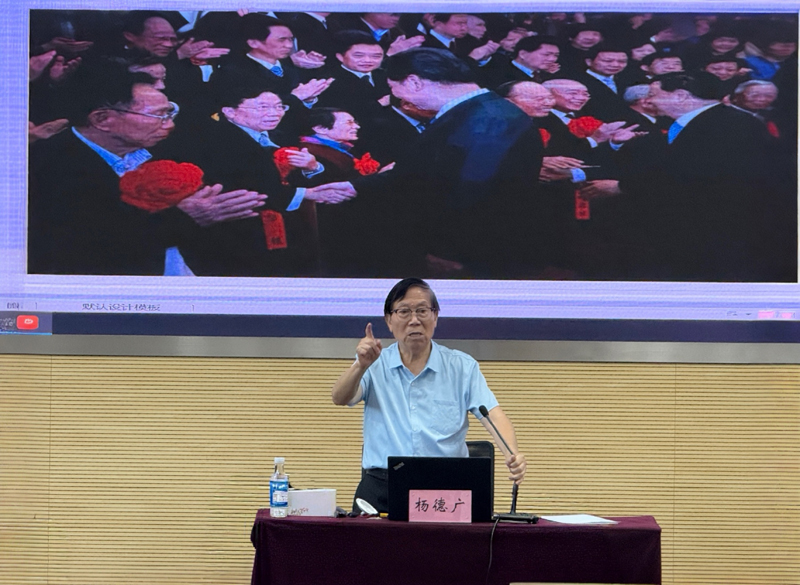 讲座伊始,杨德广教授以自编的《百字赋——中华民族历史》为引,带领全体新生回顾中国共产党波澜壮阔的百年历程与彪炳史册的千秋伟业,并从历史方位出发,引发同学们深入思考“我们从哪里来、要到哪里去”这一时代命题。他以亲身经历为线索,生动讲述了自己“苦难的童年”“艰难的青年”和“奋起的中年”三个人生阶段。从农民的儿子成长为大学教授、大学校长,杨教授始终不忘初心,全心全意为人民服务,在实现“读书梦”“图强梦”“教育梦”和“慈善梦”的奋斗路上耕耘不辍。