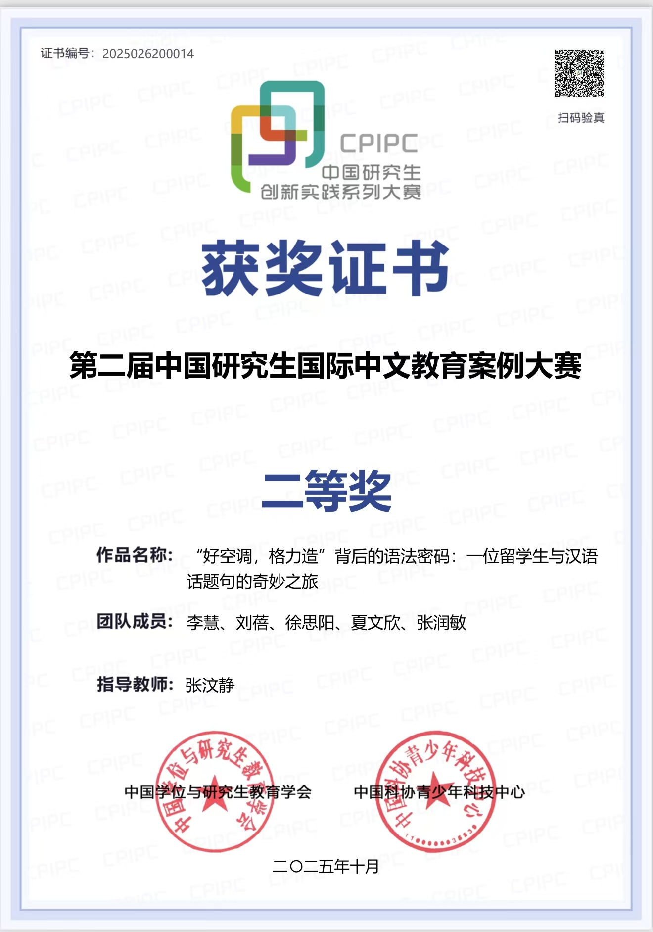 今年10月,第二届中国研究生国际中文教育案例大赛决赛在华东师范大学成功举办。本届大赛在教育部学位管理与研究生教育司、中外语言交流合作中心及全国国际中文教育专业学位研究生教育指导委员会指导、上海市学位委员会办公室与上海市学生事务中心的支持下,由中国学位与研究生教育学会、中国科协青少年科技中心主办,华东师范大学承办,澳门科技大学协办。大赛以“数智赋能教学,中文联通世界”为主题,共吸引来自285所研究生培养单位的3433师生报名参赛。经严格评审,48所培养单位的70支队伍脱颖而出,晋级全国总决赛。米粒av 米粒av 国际中文教育、语言学及应用语言学专业硕士研究生组成的团队荣获二等奖。